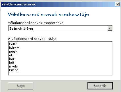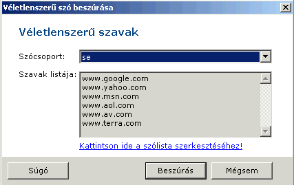 A véletlenszerűen generált szöveg helyett véletlenszerű szavakat is hozzáadhatunk a levélhez. A véletlenszerűen kiválasztott szavak listáját a Beállítások / Véletlenszerű szavak... menü alatt hozhatja létre, illetve szerkesztheti.