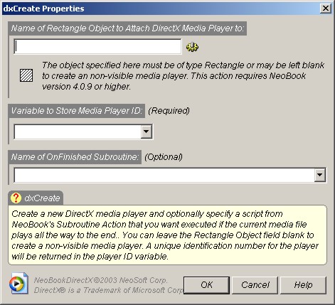 Miután kiválasztottuk a DirectX ikont, válasszuk a dxCreate műveletet a képernyő jobb oldaláról. A következő párbeszédablak jelenik meg: Name of Rectangle Object to Attach DirectX Media Player to: A Négyszög objektum neve, amit a DirectX médialejátszóhoz rendelünk. The object specified here must be of type Rectangle or may be left blank to create an non-visible media player. This action requires NeoBook version 4.0.9 or higher: Az itt megadott objektumnak Négyszög (Rectangle) típusúnak kell lennie, vagy üresen hagyhatjuk, ha egy nem látható médialejátszót kívánunk készíteni. Ez a művelet a NeoBook 4.0.9-es vagy ennél magasabb verzióját igényli. Variable to Store Media Player ID. (Required): A változó neve, ami a médialejátszó azonosítóját tartalmazza. (Szükséges). Name of OnFinished Subroutine. (Optional): Az OnFinished szubrutin neve. (Opcionális)