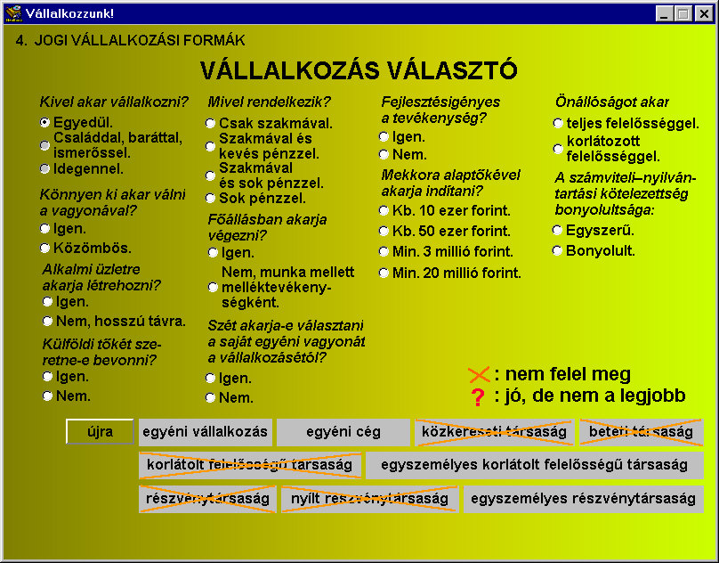 A rádiógombok segítségével objektumokat (x vagy ?) jelenítük meg. |