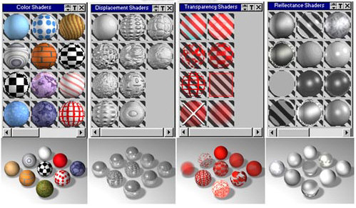 Az egyes árnyéktípusokat ugyanúgy kezelhetjük mint az anyagokat. Könyvtárból választhatjuk ki, majd a „húzd és dobd” technikát alkalmazhatjuk. Többek között: leképzett visszaverődés, árnyékfogók, köd, bőr, fa, görbületet megjelenítő árnyékok...